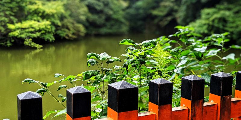 A rustic fence in Japan overlooking the scenic river and lush greenery