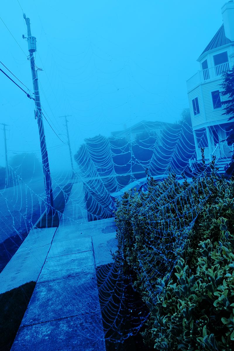 Gigantic spider webs + morning dew + a blue haze = Nightmare fuel