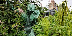 A verdant statue in the Queens Botanical Garden surrounded by lush greenery.